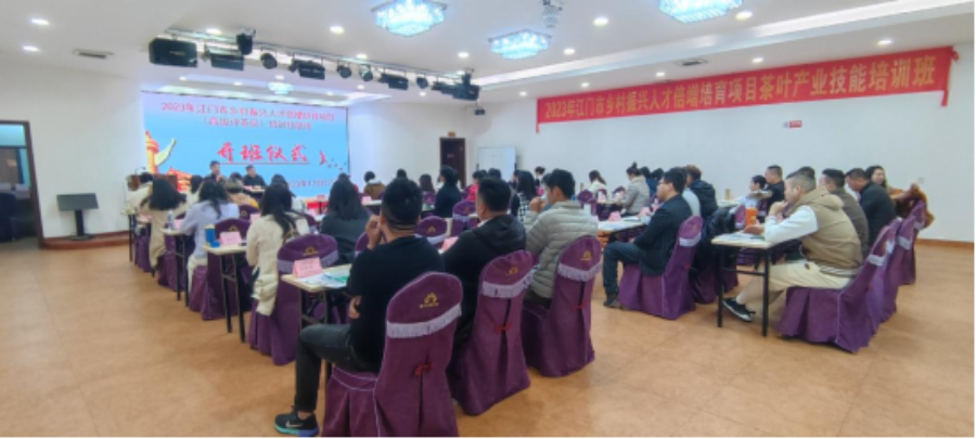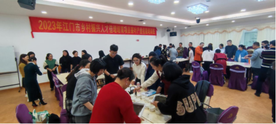 为期5天的2023年江门市乡村振兴人才倍增培育项目茶叶产业技能培训班高级茶艺师课程、高级评茶员课程分别于2023年12月18日、12月27日在江门市新会区陈皮工匠学院如期开展,由江门市农业农村局主办,广东省农科院彩田农业科技信息有限责任公司承办。培训邀请了国家级高级茶艺师为学员授课。培训学员均来自于我市茶业产业相关经营主体的茶艺技术骨干人才共100人(每班50人)。