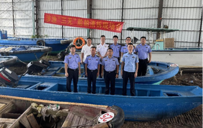 7月3日,市海洋综合执法支队派员参加台山大队在广海镇烽火角召开的涉渔“三无”船舶拆解现场会,对10艘涉渔“三无”船舶集中公开拆解。