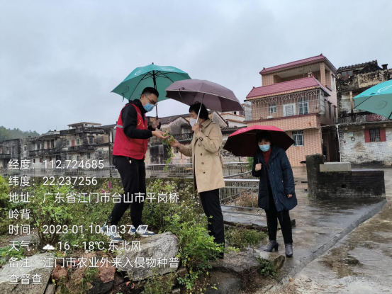 2023年1月10日,江门市农业农村局党组成员、副局长王小丽带队前往台山市开展江门市农业外来入侵物种普查项目实地督查工作,督查组一行先后到台山市台城街道水背村、岭背村踏查点现场督查我市农业外来入侵物种普查工作进展情况。