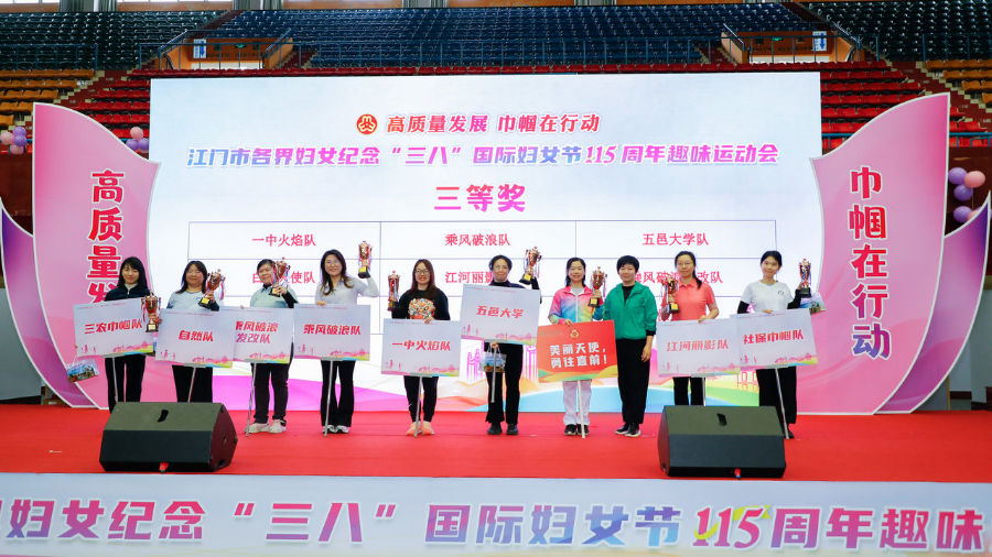 3月6日,市农业农村局女职工组成“三农”巾帼队参加由市妇联、市直机关工委联合举办的“高质量发展 巾帼在行动”江门市各界妇女纪念“三八”国际劳动妇女节115周年趣味运动会。活动中“三农”巾帼队员们团结协作,奋力拼搏,以自信的姿态展现了“三农”巾帼的时代风采,在66支参赛队伍中奋勇争先,荣获团体三等奖的好成绩。