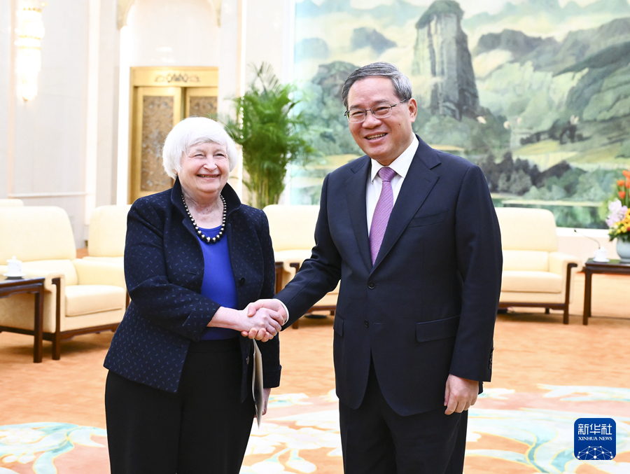 4月7日上午,国务院总理李强在北京人民大会堂会见美国财政部长耶伦。新华社记者 燕雁 摄