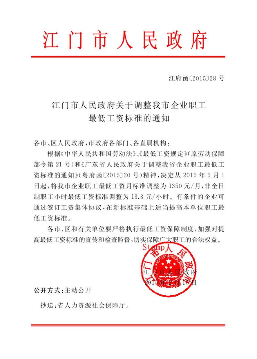 附件:江门市人民政府关于调整我市企业职工最低工资标准的通知