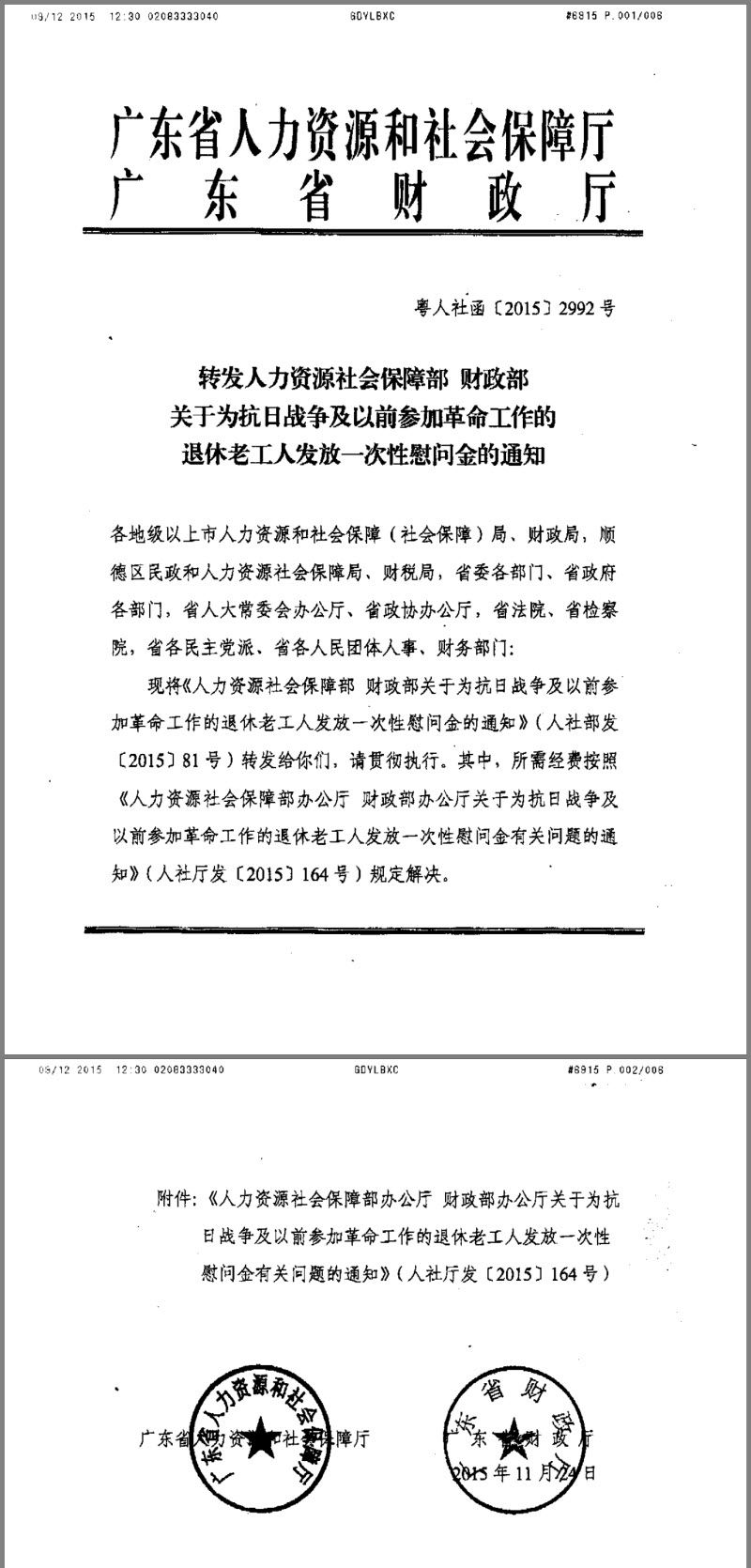 现将省人社厅、省财政厅《转发人力资源社保保障部 财政部关于为抗日战争及以前参加革命工作的退休老工人发放一次性慰问金的通知》(粤人社函〔2015〕2992号)转发给你们,请遵照执行。