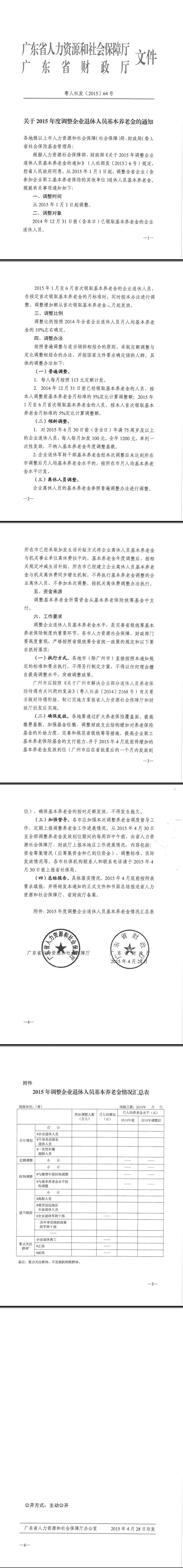 经市人民政府同意,现将省人力资源社会保障厅、省财政厅《关于2015年度调整企业退休人员基本养老金的通知》(粤人社发〔2015〕64号)转发给你们。请严格按照省规定的标准和要求,及时做好2015年度调整企业退休人员基本养老金工作,确保增加的基本养老金在5月底前发到退休人员手上。具体落实情况,请各市、区人力资源和社会保障局以书面报告形式连同附表于