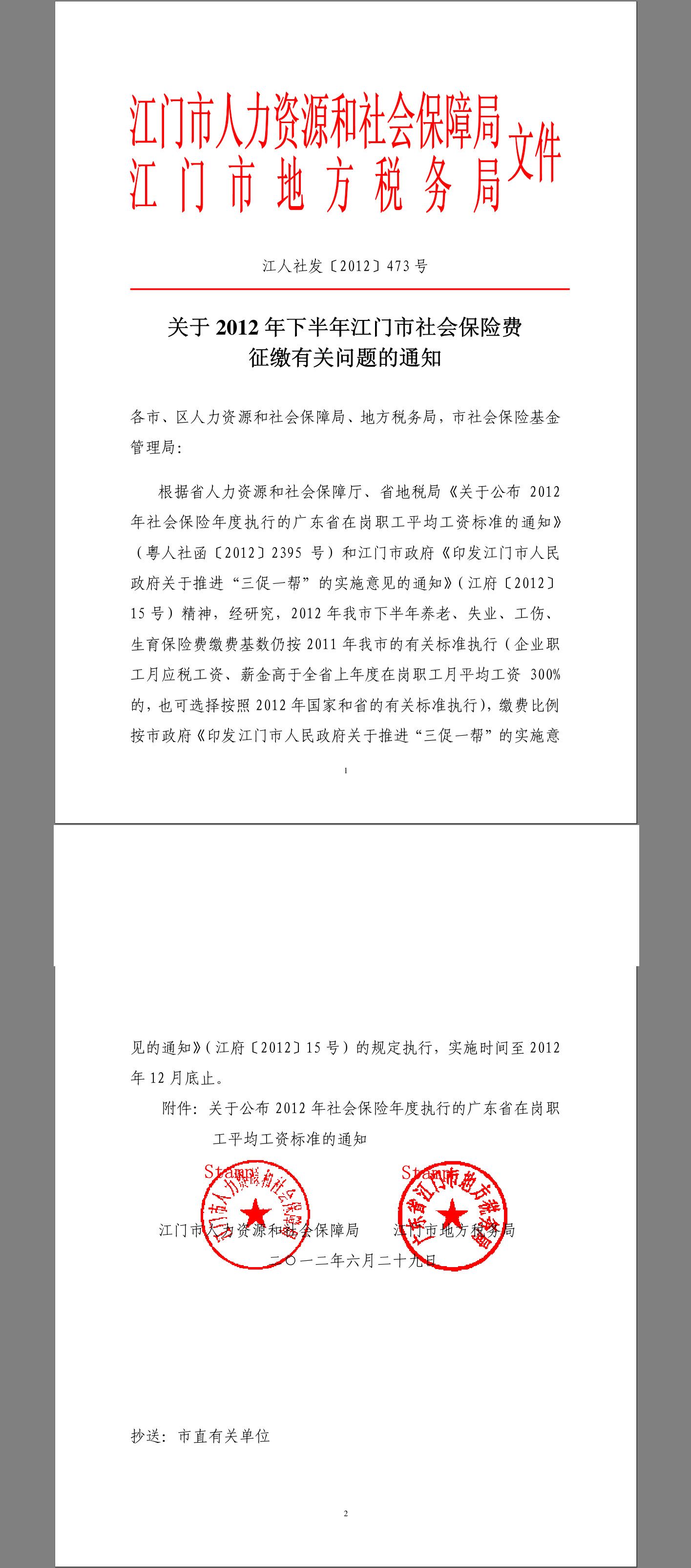 1.江人社发[2012]473号_关于2012年下半年江门市社会保险费征缴有关问题的通知