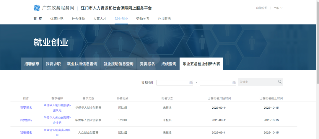 (二)进入第五届江门市“乐业五邑”创业创新大赛官方网站,点击【我要报名】;