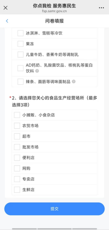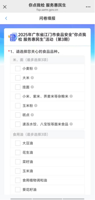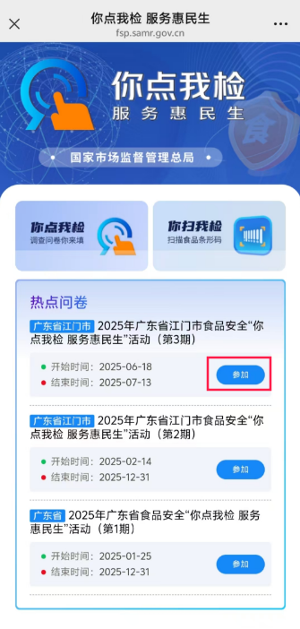 2.点击“2025年广东省江门市食品安全‘你点我检 服务惠民生’活动(第3期)”的“参加”按钮,进入“问卷填报”,选择您关心的食品品种、食品生产经营场所,最后点击“提交”,即可完成投票。