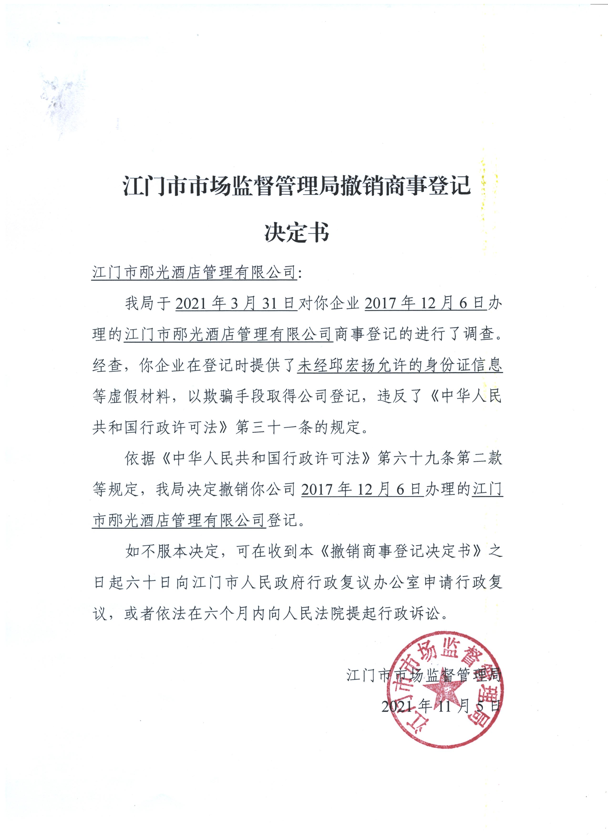 美高梅博彩撤销商事登记决定书(江门市邴光酒店管理有限公司)