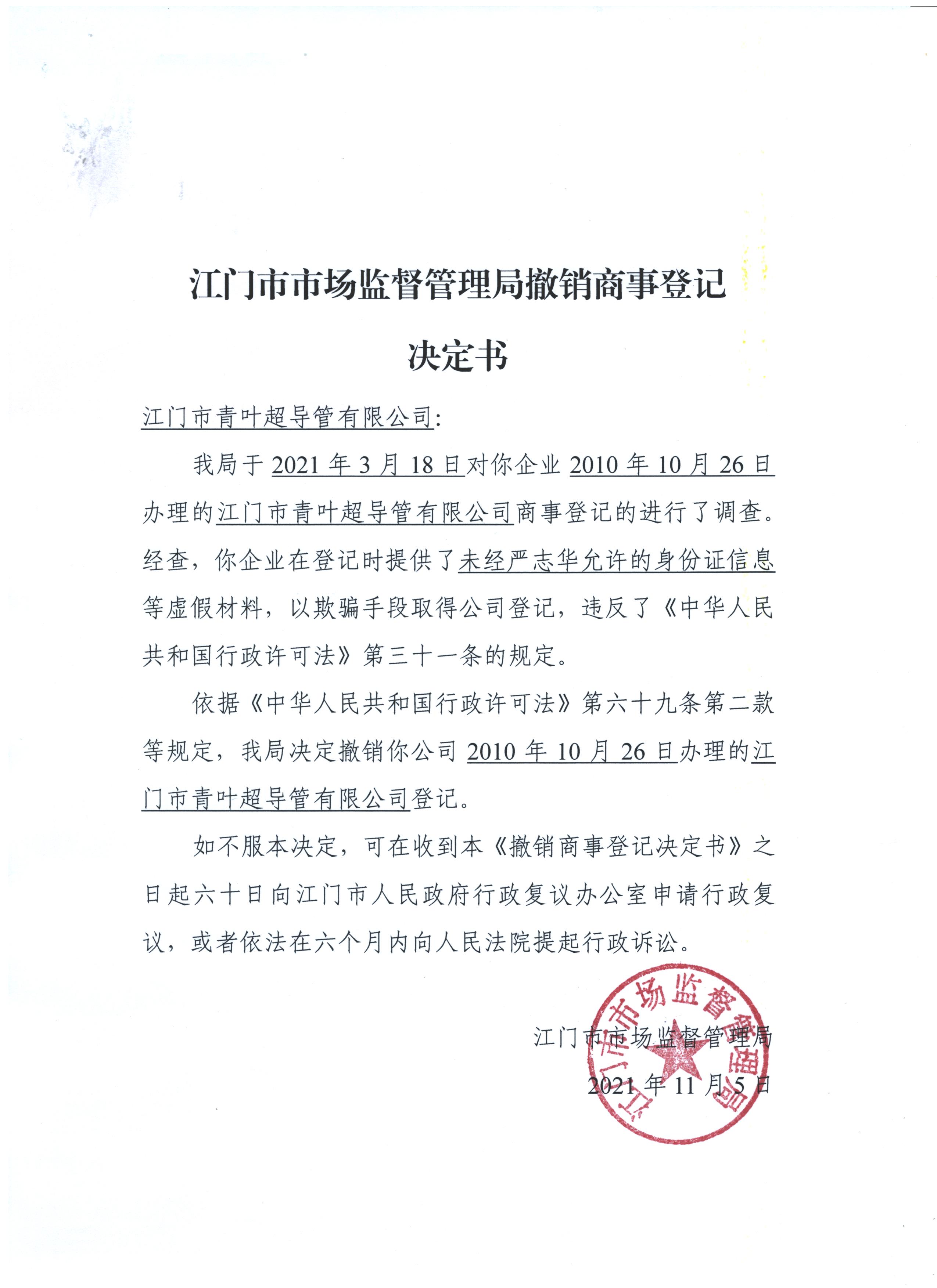 美高梅博彩撤销商事登记决定书(江门市青叶超导管有限公司9.24)