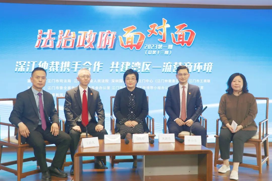 开放交流、碰撞思想、共商法治。2月23日下午,2023年首期“法治政府面对面”节目走进深圳国际仲裁院江门中心。江门市司法局党组书记、局长芶晓彤,江门市委副秘书长、深圳国际仲裁院江门中心主任、江门仲裁委员会主任黄郭勇,市中级人民法院三级高级法官谢敏忠,市工商联四级调研员林小芳做客节目,畅谈深江仲裁合作,携手共建湾区一流营商环境。江门市总商会常务委员黄晓涛,江门照明电器行业协会秘书长罗志达,市司法局、市中级人民法院、市工商联部分干部、企业家和群众代表50余人受邀参加节目,市司法局四级调研员、江门仲裁仲裁工作事务中心负责人蓝军主持节目。