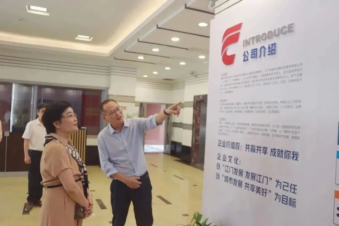 芶晓彤一行先参观了江门发展集团一楼企业文化展览厅,详细了解江门发展集团的概况和企业价值观、企业文化、党建工作等方面情况,并认真听取了江门发展集团经营发展情况介绍。
