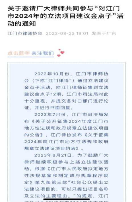 为全面贯彻党的二十大精神,认真实施新修改的立法法,牢牢把握好政府立法践行全过程人民民主要求,市司法局以征集2024年度江门市地方性法规和政府规章立法建议项目为抓手,充分调动政府立法基层联系点前沿阵地作用,使基层立法需求联通职能部门,注重借用“外脑”和建设“储备库”,稳中求进推动我市新时代政府立法工作高质量发展。