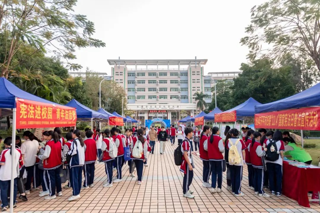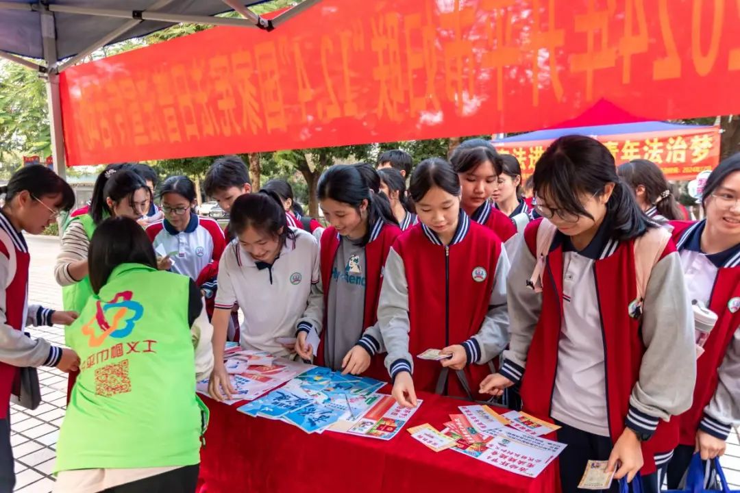 在开侨中学主校道的普法集市上,来自市人民法院、市人民检察院、市司法局等10个部门现场组成“宪法宣讲团”,以摊位式宣传阵列组成“学法大道”,各部门工作人员积极向过往师生们和参与活动人员派发各类宪法宣传资料,耐心地解答涉及未成年人保护、校园安全、民事纠纷等多个领域的法律问题。为增加宪法宣传趣味性,开平市普法IP形象“侨小法”“侨小律”化身“普法园丁”,向师生们发出现场学法打卡邀请,吸引了一众学生前来参与互动学法,手持宪法宣传牌合影留念,以寓教于乐、寓教于学的氛围,在青少年当中撒播尊宪崇法的“种子”。