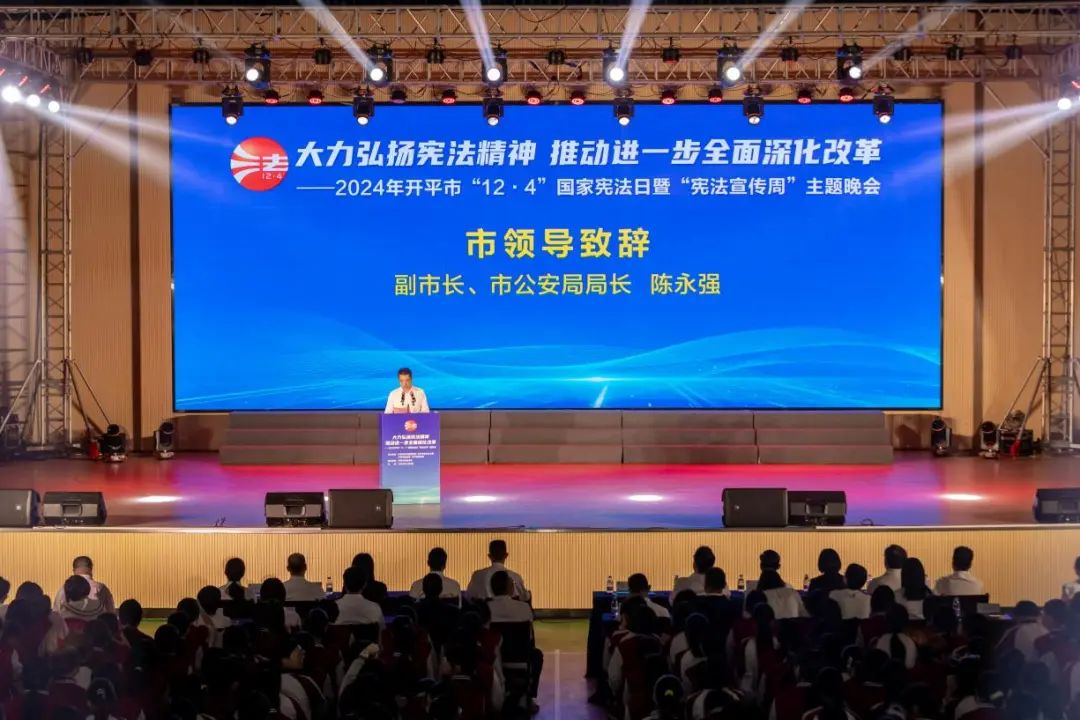 12月4日,2024年开平市“12·4”国家宪法日暨“宪法宣传周”主题晚会圆满落幕。本次主题晚会由开平市司法局、开平市普法办公室及相关部门联合举办,围绕“大力弘扬宪法精神,推动进一步全面深化改革”主题,旨在通过“普法集市+文艺晚会”形式,以群众喜闻乐见、形式丰富的法治文化盛宴,在侨乡大力弘扬宪法精神,以法治凝聚改革共识,为进一步全面深化改革、推进中国式现代化营造良好法治环境。开平市副市长、公安局局长陈永强,市委全面依法治市委员会守法普法协调小组成员单位有关领导及参演学校师生共计2400余人参加。