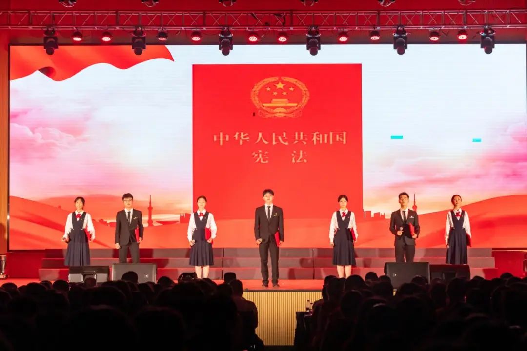 晚会在播放宪法宣传视频中拉开序幕,开平市副市长、公安局局长陈永强发表致辞,强调了宪法宣传的重要意义和深远影响,指出要大力加强宪法学习宣传,为进一步全面深化改革、推进中国式现代化营造良好法治环境。开平市司法局党组书记、局长林上金担任本次主题晚会的“宪法宣讲人”,深入浅出阐释了《中华人民共和国宪法》的发展历程与重大意义,并对宪法宣誓制度进行深入解读,让现场师生和参与活动人员对宪法有了更深刻的历史认知和理论理解。他勉励同学们要珍惜在校时光,深入学习宪法,让宪法精神在校园中生根发芽。