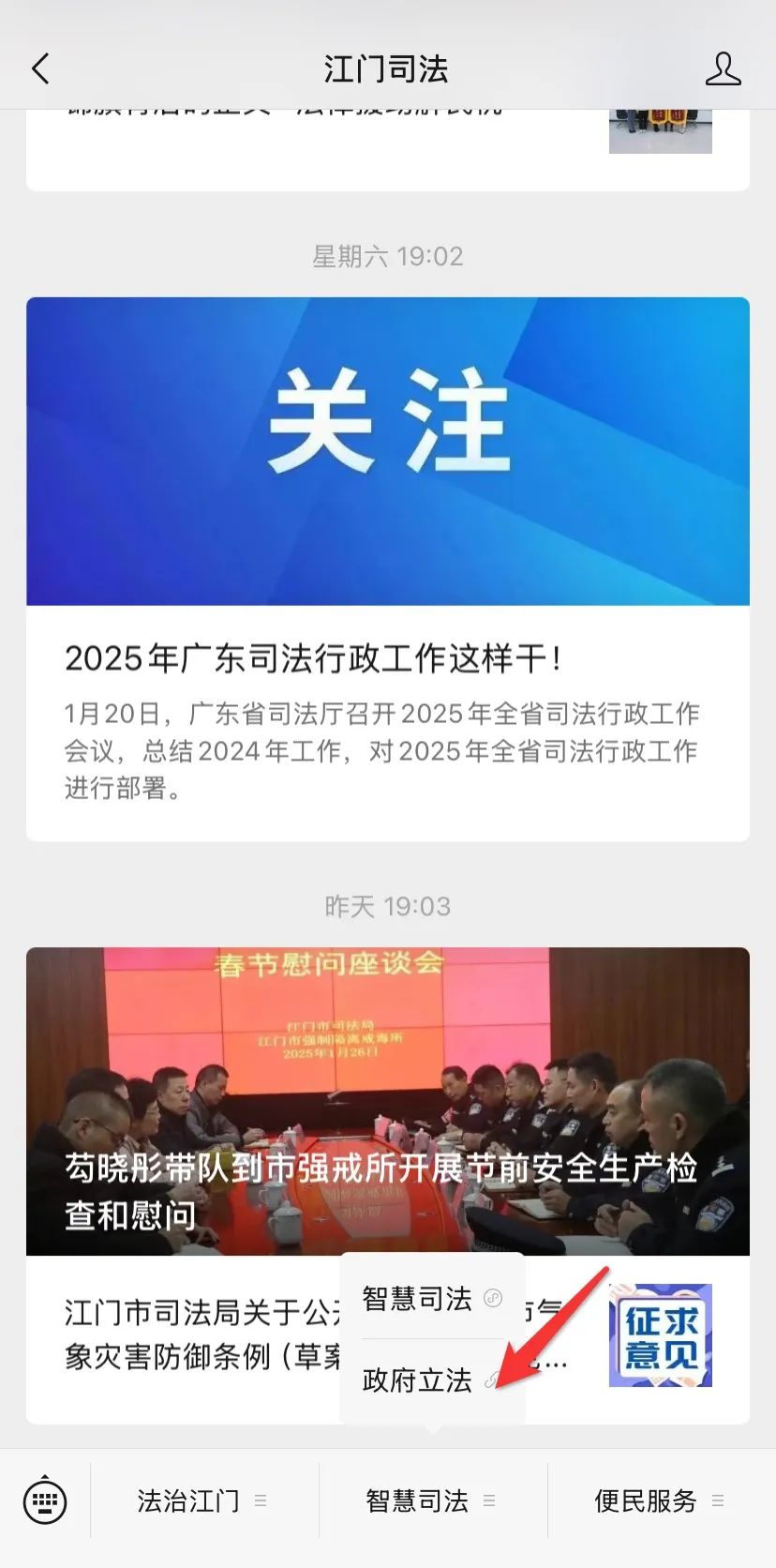 方法一、打开“江门司法”微信公众号,在中间的菜单栏选择“政府立法”