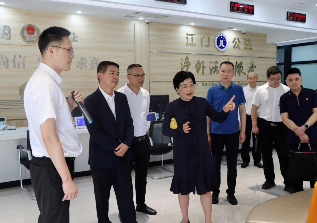 签署仪式前,深圳市司法局一行参观了江门市公共法律服务中心,认真听取中心运行情况介绍,详细了解中心建设、涉外法律服务、涉侨纠纷联合调解室、政协律师委员工作室及“法治政府面对面”专题访谈、线上“法治大讲堂”直播、“律动江门 法润江门”周六一小时义务法律咨询三大公共法律服务品牌活动情况,深入考察海外远程视频公证试点、“江门智慧司法小程序”、“涉外法律服务地图小程序”、“一证即办”公证服务等智慧司法建设成果。