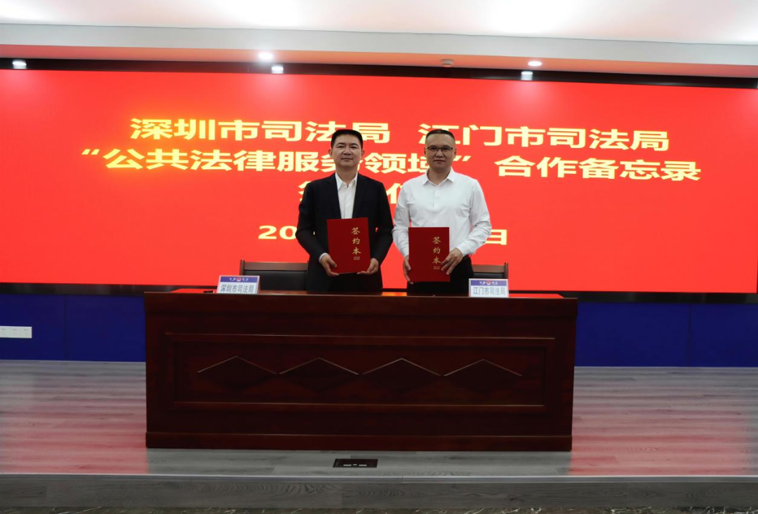 3月28日上午,深圳市司法局、江门市司法局在江门市公共法律服务中心举行"公共法律服务领域"合作备忘录签署仪式。两地司法行政系统以深中通道开通后珠江口东西两岸加快融合发展为契机,聚焦公共法律服务提质增效,共同签署《深圳市司法局 江门市司法局"公共法律服务领域"合作备忘录》,标志着深江两地司法行政合作迈入新阶段。深圳市司法局党委委员、副局长邵宝洲,江门市司法局党组书记、局长芶晓彤,党组成员、市律师行业党委专职副书记彭高宴,党组成员、副局长胡振宇,党组成员、政治处主任翟继铭及两地相关业务部门同志参加活动。