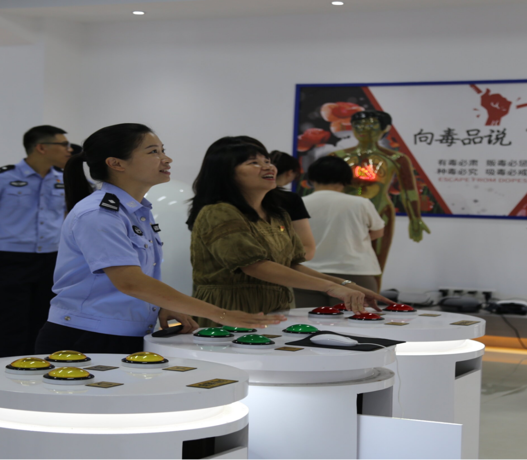 在市强制隔离戒毒所禁毒教育基地,民警通过馆内设置的毒品种类区、毒品危害区、VR体验区等板块,向参加活动的党员多维展示了仿真毒品模型,介绍毒品种类,并结合具体案例进行剖析,让大家深入了解吸毒对健康、家庭及社会的严重危害。