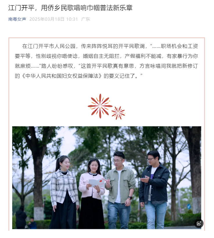 “南粤女声”微信公众号转载开平普法民歌《妇女权益有保障》MV