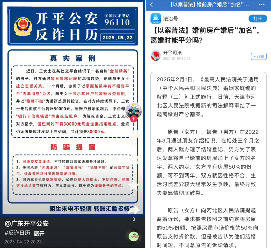 开平市将新媒体新技术普法纳入全市“八五”普法规划和年度法治宣传教育工作要点,利用全市各镇(街)各部门微信公众号、抖音号等新媒体宣传资源构建“普法矩阵”,围绕群众关注的焦点热点问题,通过发布法律法规解读、普法资讯、法治文化作品等方式,向群众宣传和普及宪法、民法典、禁毒、反诈、消防、劳动保障、公证、人民调解等各类法律知识,推动以案释法常态化,持续拓宽“掌上普法”覆盖面,提高群众“指尖学法”便捷度。其中,开平市司法局以“开平司法”账号入驻法治日报“法治号”平台,共发布法律法规解读、以案普法、扫黑除恶、禁毒等宣传信息53篇,阅读量达3万人(次)。