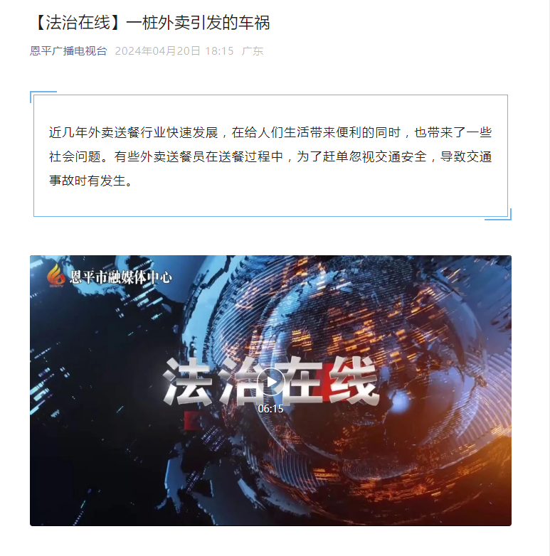 “八五”普法规划实施以来,恩平市围绕改进法治宣传教育方式和提升法治宣传教育质效的目标,积极探索创新工作举措,通过新媒体新技术在普法领域的深度应用,打造《法治在线》《普法小剧场》《小恩说法》等全新普法产品,成功推动法治宣传教育从“有形覆盖”向“有效覆盖”跨越升级——让普法内容突破圈层壁垒,真正实现“破圈”传播、“出圈”入心。