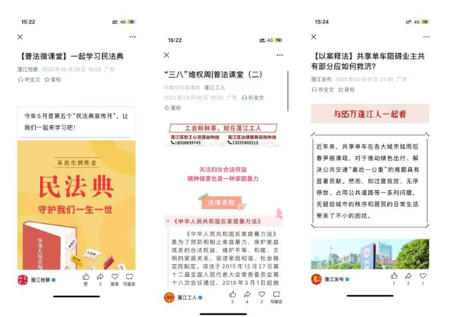 多平台联动构建普法生态。蓬江区联合多部门依托“蓬江发布”“蓬江政法”“蓬江检察”“蓬江公安”“蓬江工人”等区级新媒体平台,开设“法治微课堂”“以案说法”等专栏,发布普法推文、短视频,形成“区级统筹、部门联动、全民参与”的普法生态。