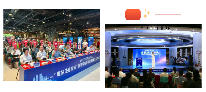 8月22日,一场形式创新、内容易懂、场所开放、互动亲民的普法评议,在江门购书中心以别样的姿态和群众见面。这是江门市举行的2025年国家机关“谁执法谁普法”履职报告评议会暨市普法工作联席会议,由市委依法治市办、市普法办、市司法局联合主办。市司法局党组书记、局长、二级巡视员,市普法工作联席会议召集人芶晓彤出席会议,市普法工作联席会议成员单位相关负责同志及评议团专家评委、群众代表等参加会议。