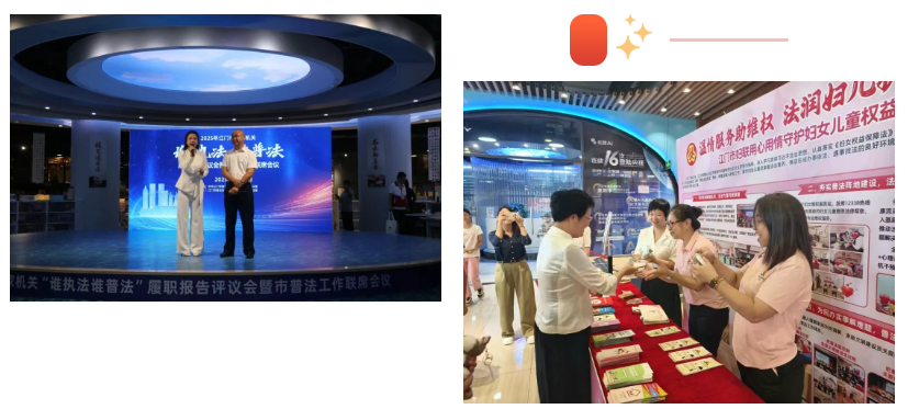 历年的普法评议均在政府机关内部举行。今年的履职报告评议会由政府机关更改为江门购书中心这一开放的公共场所。江门购书中心位于江门市蓬江区荣基广场三楼,营业面积达5600㎡,是江门目前面积最大、图书品类最多的书店。现今正值暑假期间,购书中心内早早就聚集了不少家长和孩子,他们以观看、询问、答题等形式积极参与现场活动;接受评议单位的普法志愿者们与家长孩子交流互动,派发法律法规政策宣传册,解答疑难问题,整个评议会现场成为了一场大型普法“直播秀”。