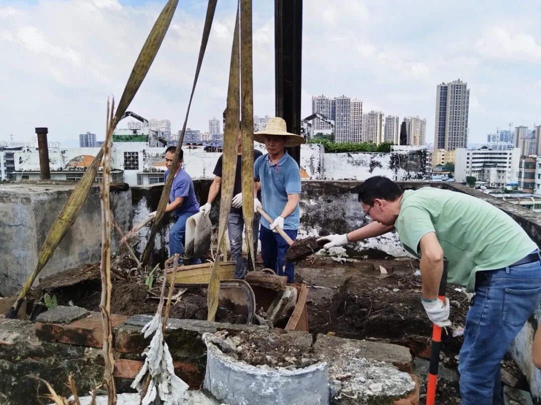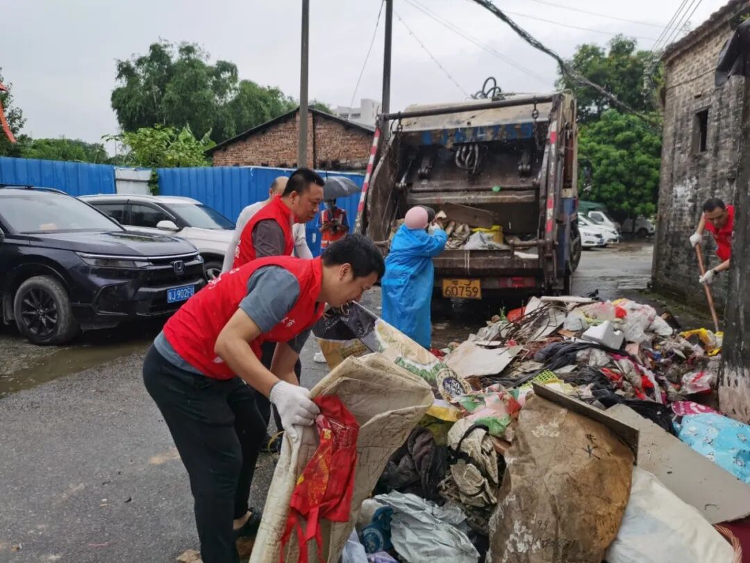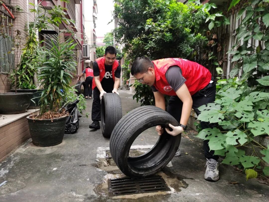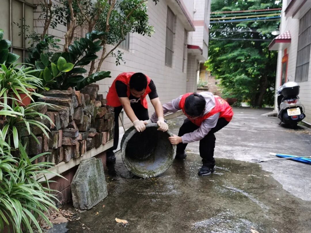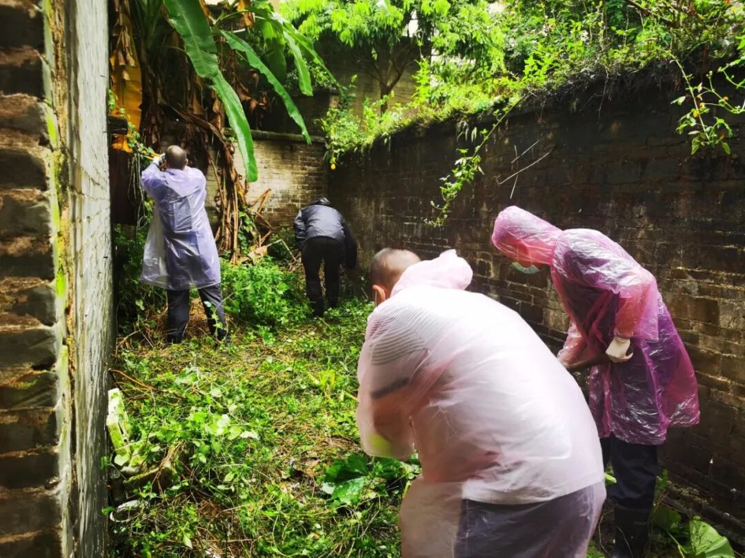 突击队兵分多路,直奔重点防控区域,冒雨进驻蓬江区里村社区、鹤山市沙坪街道越塘村、江海区礼乐文昌沙社区和向民村开展支援。针对闲置楼房、荒地、天台、坑洼地、背街小巷等蚊虫孳生高频区域,队员们拉网式排查、地毯式清理,重点开展垃圾清运、积水清除等环境整治,从源头压缩蚊虫生存空间。同时,积极配合社区开展入户宣传,发放防控资料、讲解防蚊知识,协助完成灭杀药物分装、群众验血引导等便民服务,用脚步织密防控末梢网络。