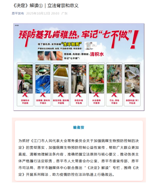 为切实织密基孔肯雅热等虫媒传染病防控网,精准落实《江门市人民代表大会常务委员会关于加强病媒生物预防控制的决定》(以下简称《决定》),恩平市司法局多维度发力,通过政策解读、靶向宣传、专业服务,将法治防控理念传递到城乡每个角落,切实筑牢群众健康防线。