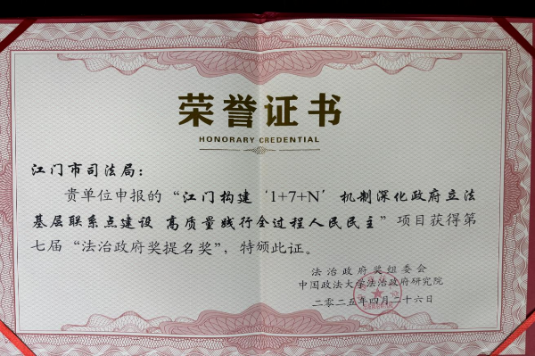 2025年4月,《江门构建“1+7+N”机制深化政府立法基层联系点建设 高质量践行全过程人民民主》项目获第七届“法治政府奖”提名奖。