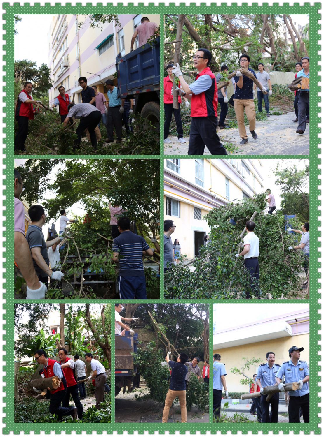 清搬树木残枝,恢复道路畅通。日前,台风“天鸽”和“帕卡”的侵袭对我市造成了重大损失,不少大树连根拔起,残枝落叶、垃圾遍地可见,交通堵塞,影响了居民的正常生活。市审计局联动丰乐社区、驻点派出所义工们,由党员带头、警民合力,协助师傅把阻碍交通的树枝切割截断,然后一一把树木残枝搬到车上,搬了一车又一车。冒着高温酷暑,大家即使汗流浃背,也没有半句怨言,充分发挥了不怕苦、不怕累的精神,充分展现了党员干部的先锋模范风采。
