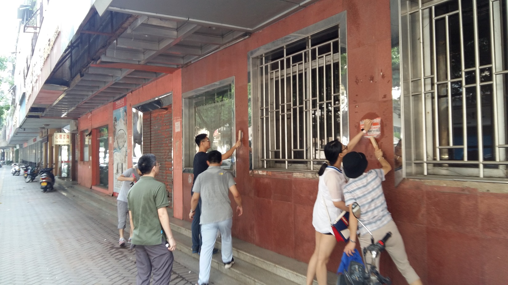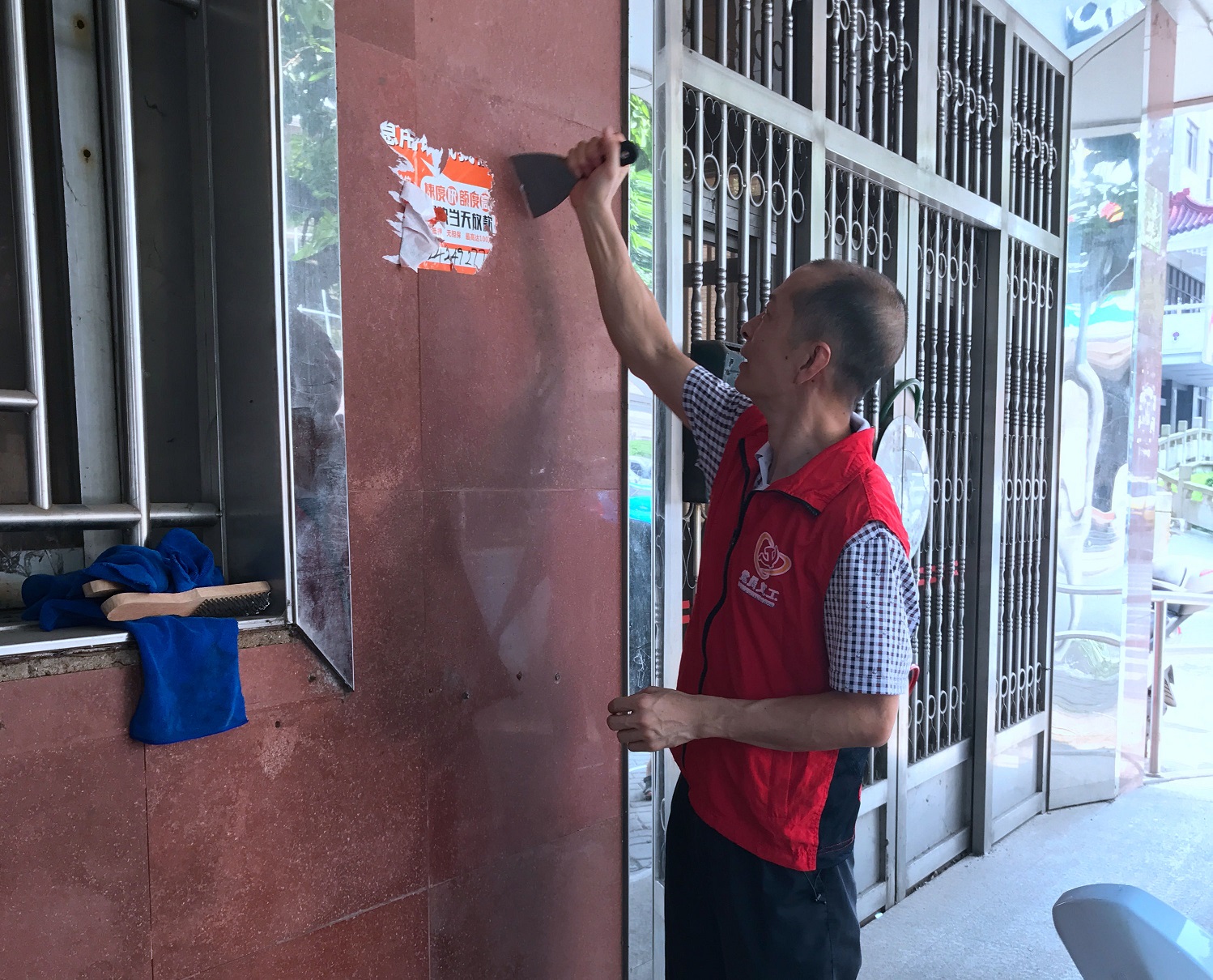 一路义工重点清除“牛皮癣”。在社区房屋的墙壁、门窗以及电箱等处贴了一些五花八门的小广告,小广告像“牛皮癣”一样,不仅影响市容市貌,还会有些不真实不健康的信息让居民受骗。义工们顶着烈日,冒着高温酷暑,手拎小水桶,拿着刷子、铲子等,仔细地把牛皮癣铲除干净,并把散落在地的纸屑、杂物等清除干净,恢复社区整洁容貌。
