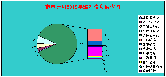 2015年在局门户网站发布政府信息226条,包括机构概况类信息2条,政务公开类信息196条,党务公开类信息5条,专题活动类信息9条,审计百科类信息14条。其中政务公开类信息有工作动态81条、基层动态25条、资金信息3条、人事信息9条、时政要闻类信息58条,通知公告8条,审计结果公告7条,政策法规5条。在江门市政府信息公开目录系统发布政府信息104条,含美高梅博彩1条,信息公开工作报告1条,组织机构类信息1条,部门文件类信息5条,办事指南类信息2条,工作动态类信息80条,部门财政预决算类信息2条,“三公”经费类信息1条,其他通知公告类信息4条,审计结果公告7条。