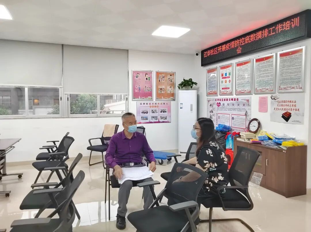 11月26日下午,局党组书记陈树歆刚完成巡河工作,马上连轴转来到江华社区调研疫情防控、“三询问一完善”工作情况。他认真听取了社区党委书记陈雅兰的工作汇报,了解防疫数据登记和“粤居码”申报工作、创文工作的进展情况,以及存在的问题和困难,并现场商讨解决方案。