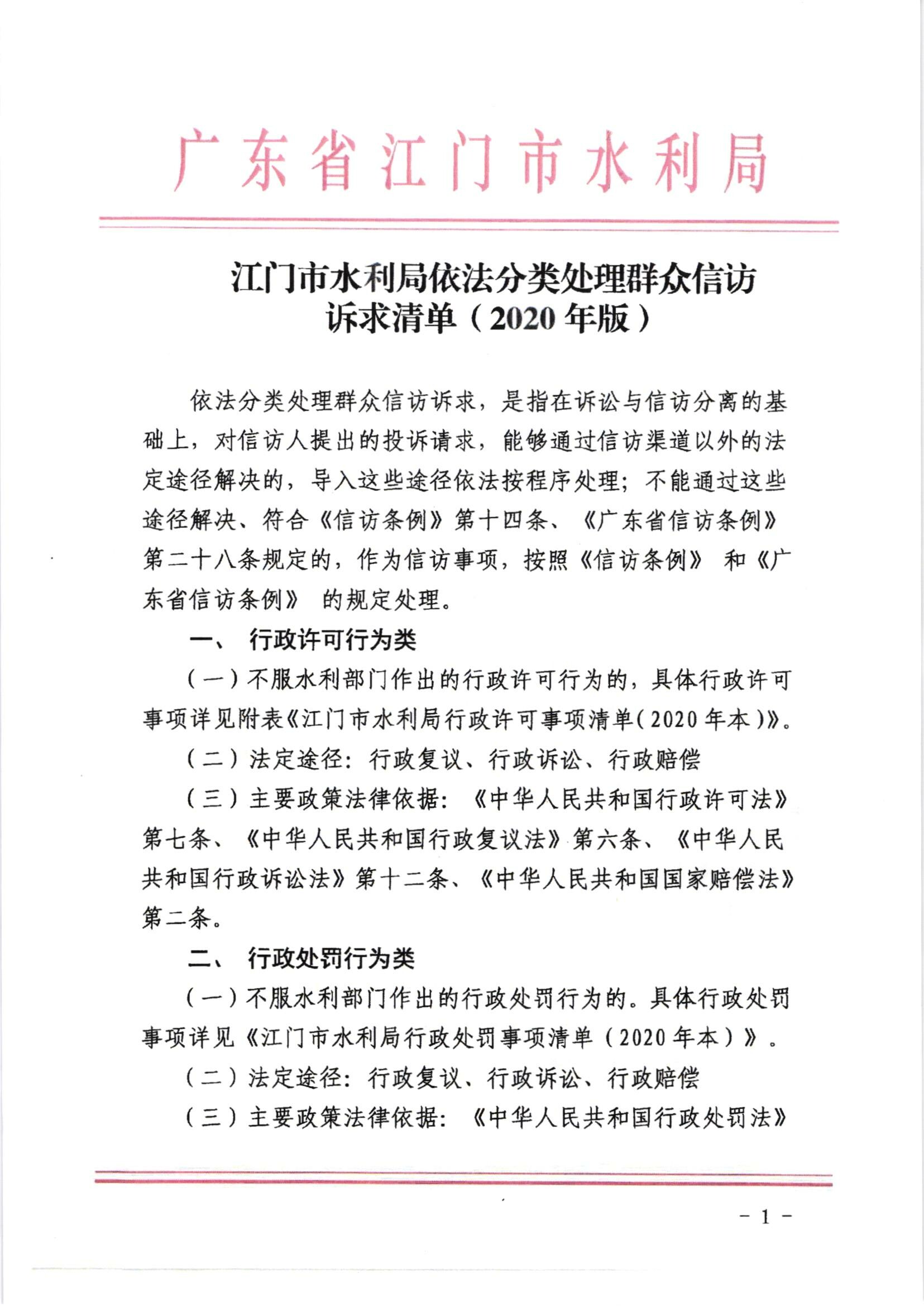 江门市水利局依法分类处理群众信访诉求清单(2020年版)