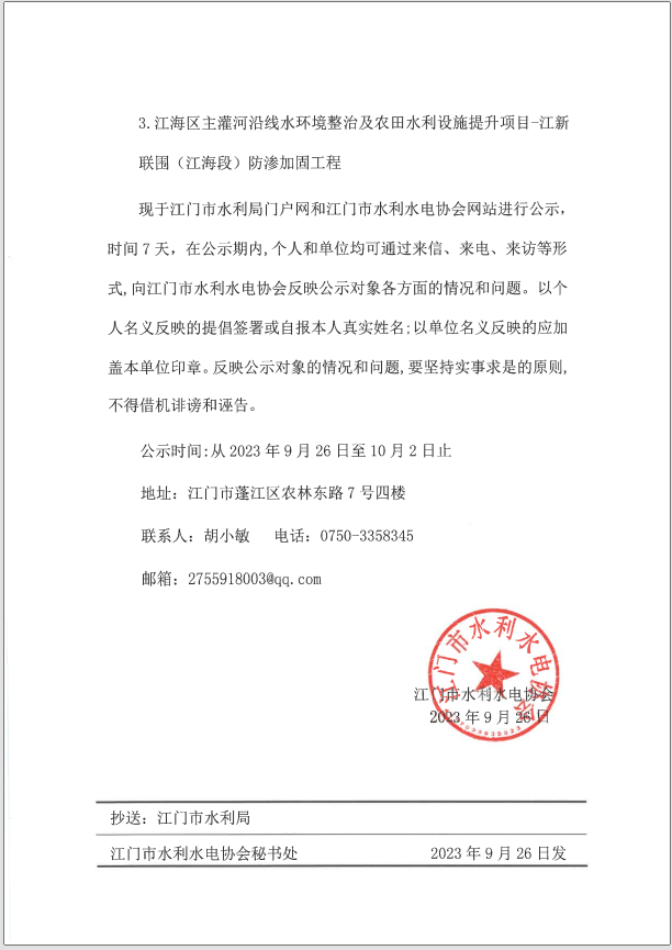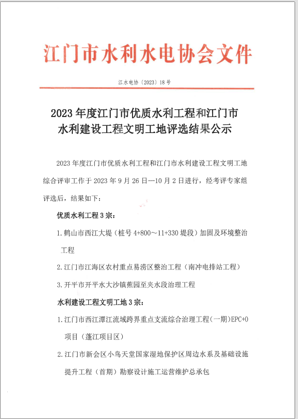 2023年度江门市优质水利工程和江门市水利建设工程文明工地评选结果公示