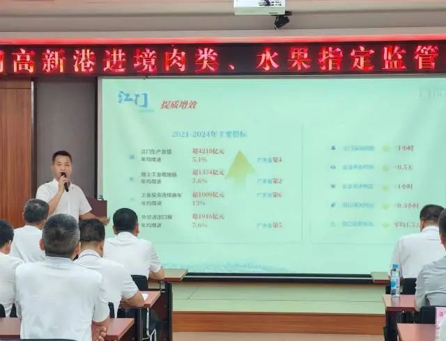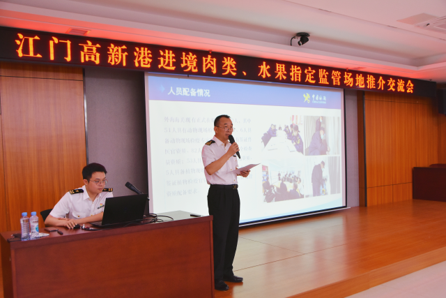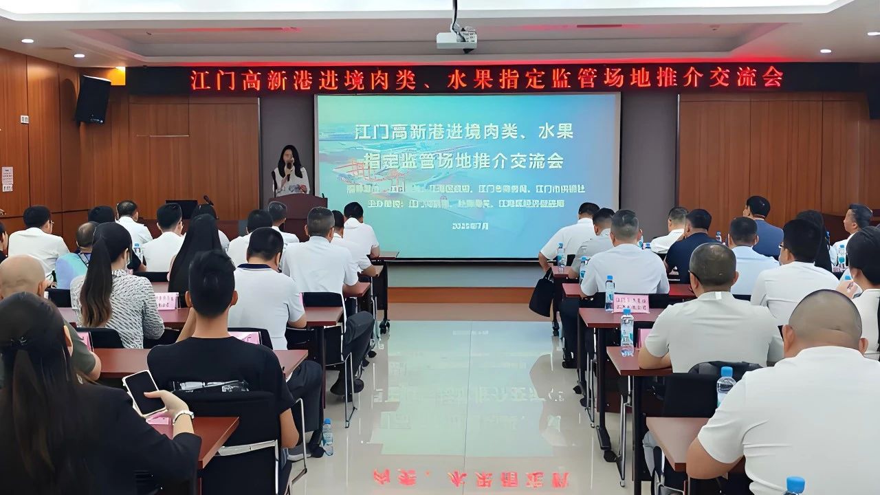 7月30日,由江门海关、江门市商务局(口岸局)、江海区政府、江门市供销社指导,江门高新港务发展有限公司、外海海关、江海区经济促进局联合主办的江门高新港进境肉类、水果指定监管场地(以下简称“高新港指定监管场地”)推介交流会在江海区成功举办。活动旨在帮助进口企业进一步了解高新港综合优势和通关政策,支持企业用好高新港指定监管场地开展有关进口业务,为江门外贸高质量发展注入新动能。活动吸引了进口肉类、水果和冷冻水产品重点企业及相关商(协)会代表超80人参加。