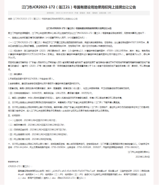 近日,位于江门市蓬江区院士路西侧陈朗坑地段的市本级政府储备地块正式挂牌出让,该地块用途为其他商服用地、住宅用地;建设用地面积47007.55㎡(约70.5亩),容积率最高2.3,起拍总价54060万元,折合楼面价5000元/㎡,网上限时竞价时间为2023年12月8日9时起。