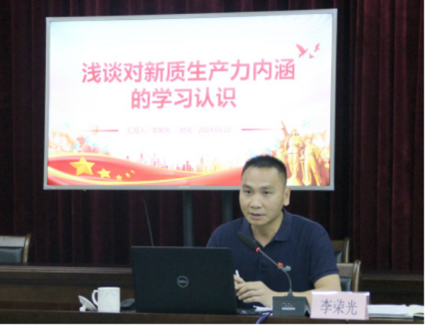 党组成员李荣光以《浅谈对新质生产力内涵的学习认识》为主题,围绕新质生产力的内涵、主要特征、发展新质生产力的必要性以及发展新质生产力需要做好哪些工作等几方面为全体党员讲了一堂生动的党课。李荣光强调,作为土地储备部门,全体干部职工要深刻领会发展新质生产力的方法论,围绕做实“黄金内湾”“大桥经济”文章,为我市优化产业布局、建好园区载体提供用地保障;要持续建优体制机制,进一步提升收储效率和土地价值;要主动对标“深圳品质”,研究对政府储备土地开发条件进行优化调整,促进产城融合,为提升城市品质、推动我市高质量发展贡献力量。