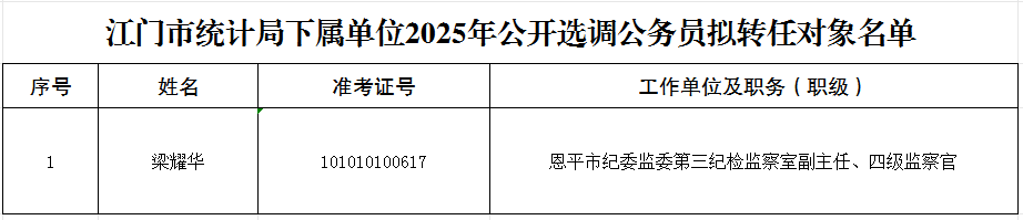 根据《江门市统计局及下属单位2025年公开选调公务员公告》有关要求,经过笔试、资格复审、面试、体检和考察等程序,确定梁耀华同志为江门市统计局下属单位2025年公开选调公务员拟转任对象(名单详见附件),现予以公示。公示期间如对人选有异议,请向江门市统计局反映。