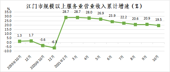 今年以来,全市规模以上服务业保持平稳发展。1-10月,全市规模以上服务业营业收入实现178.00亿元,同比增长19.5%,增速较1-9月放缓1.4个百分点;两年平均增长9.9%。