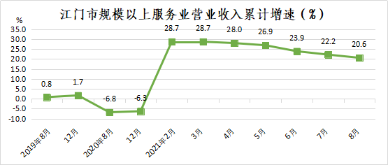 江门市规模以上服务业稳定恢复,步伐放缓。1-8月全市规模以上服务业营业收入140.60亿元,同比增长20.6%,增速比1-7月低1.6个百分点;两年平均增长10.3%。