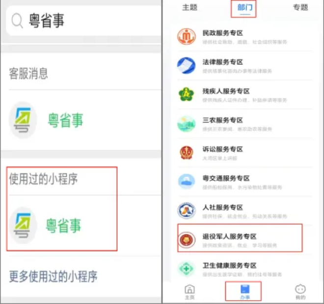 (1)访问微信小程序“粤省事”—办事—部门—退役军人服务专区。