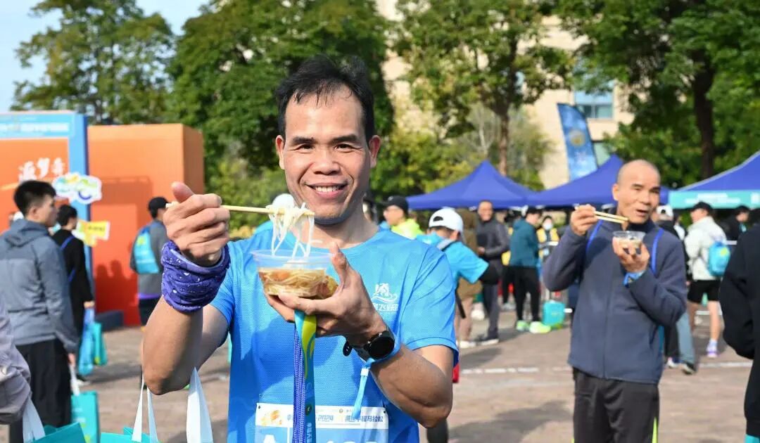 跑在“天然氧吧”,不仅能看尽秀美风光,还能品尝舌尖美味、享受身心舒爽。赛后特意设置的美食区,一阵阵诱人的香气扑鼻而来,刚结束激烈比赛的拿到完赛包的选手们瞬间忘却疲惫,聚在美食摊位前,品尝着地道的恩平特色美味。
