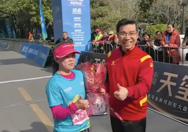 恩平市委副书记、市长赖惠镇向幸福天玺湾·2024恩平温泉半程马拉松最后一名选手献花。这一刻,无论名次先后,每位跑者都是赛道上的英雄,他们用自己的行动诠释了马拉松精神,那就是无论遇到多大的困难,都要坚持到底,永不放弃。