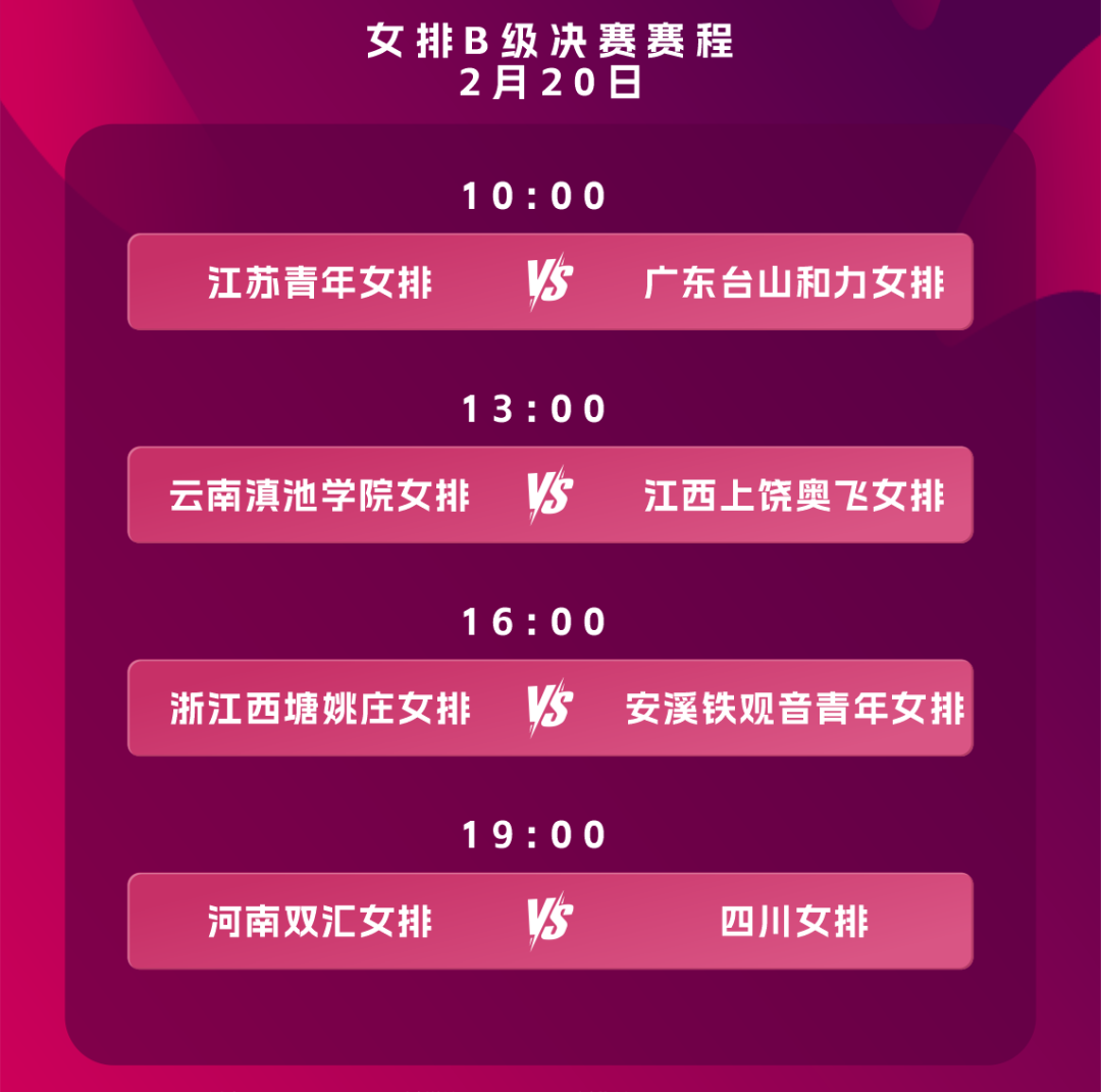 20日的比赛,江苏青年女排与广东台山和力女排将进行七、八名的决赛,云南滇池学院女排与江西上饶奥飞女排进行五、六名的决赛,福建安溪铁观音青年女排与浙江西塘姚庄女排进行三、四名的决赛,冠亚军则通过三场两胜制,在四川女排与河南双汇女排之间产生。