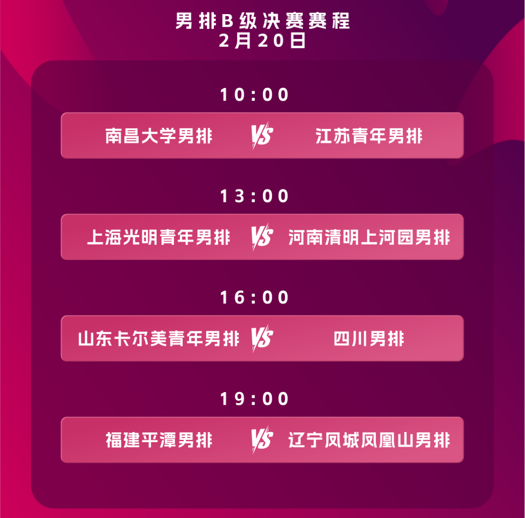20日的比赛中,南昌大学男排对江苏青年男排、上海光明青年男排对河南清明上河园男排、山东卡尔美青年男排对四川男排、福建平潭男排对辽宁凤城凤凰山男排。