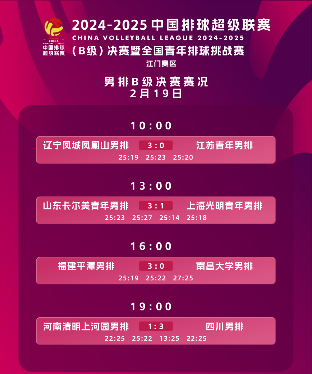 2月19日是2024-2025中国排球超级联赛(B级)决赛暨全国青年排球挑战赛的第二个比赛日,女子和男子的比赛分别在江门体育中心体育馆的主馆和副馆同时进行。男子经过四场比赛,决出四强,分别是辽宁凤城凤凰山男排、山东卡尔美青年男排、福建平潭男排和四川男排;女子的比赛经过两天的角逐,赛出了一至八名的对阵。